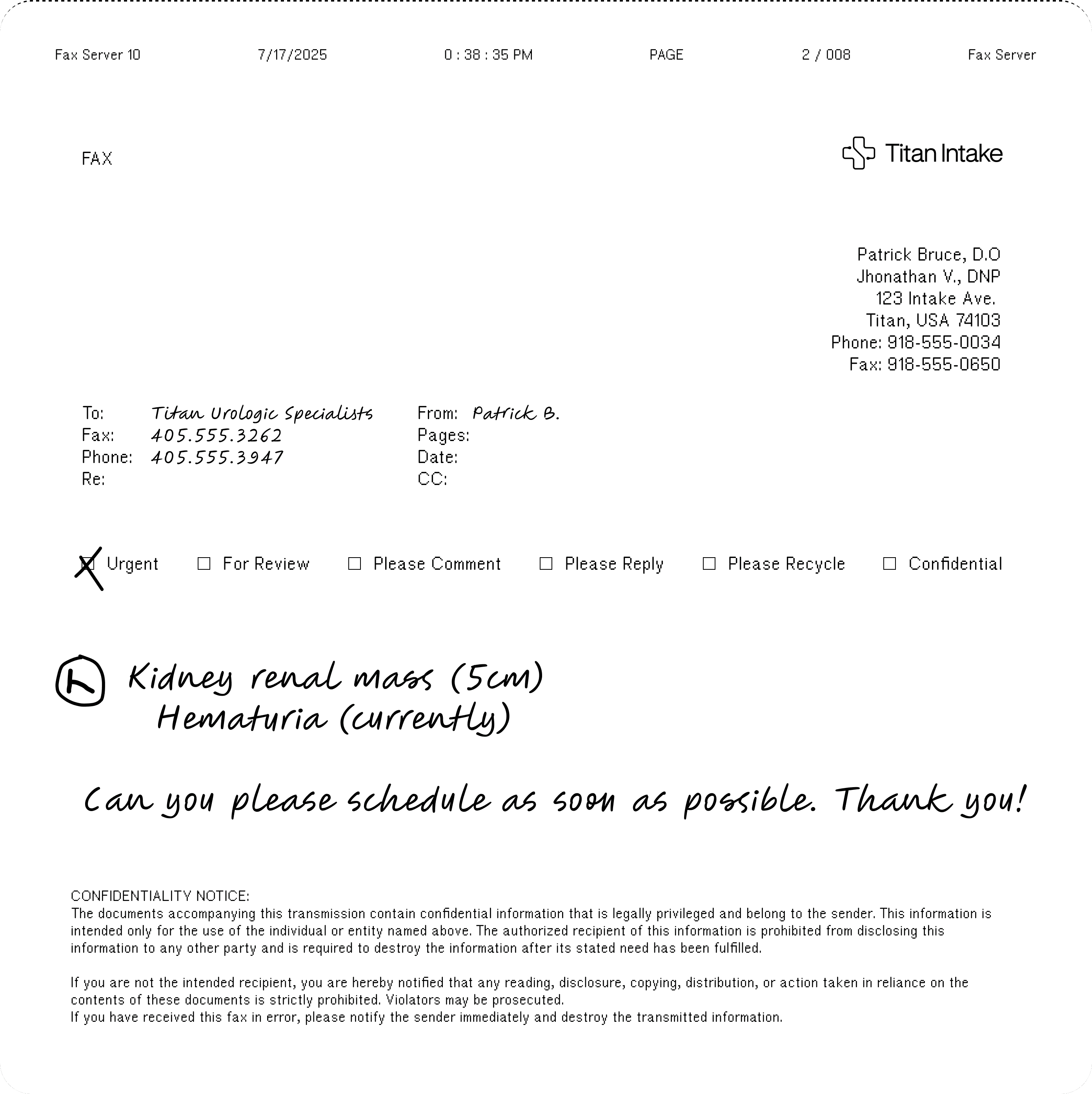 Titan Intake transforms every incoming document into a ready-to-act task, automatically. This continuous loop captures, organizes, and routes patient information so nothing gets lost, delayed, or forgotten.